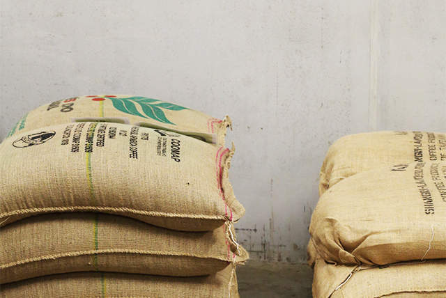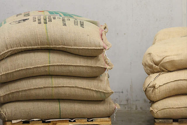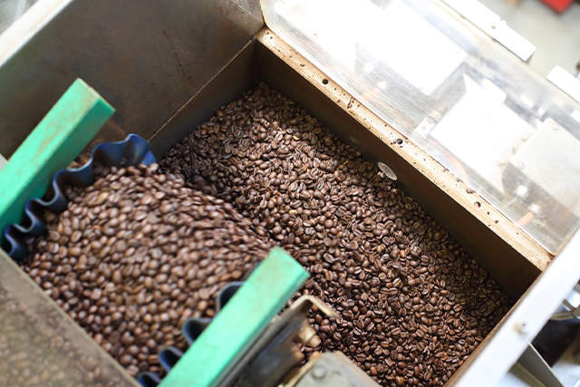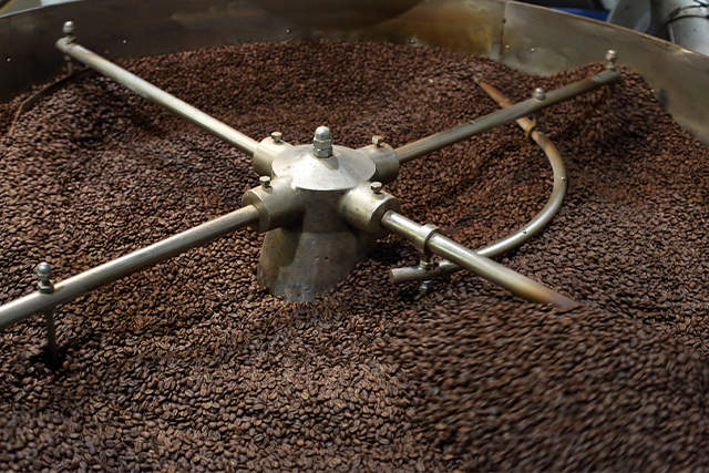 MB: "Wir rösten im Langzeittrommelröstverfahren – das bedeutet eine Röstdauer von 15-20 Minuten. Der Rohkaffee kommt in die Trommel, die durch Gas erhitzt wird und rotiert, damit die Bohnen in Bewegung bleiben und gleichmäßig geröstet werden. Dann passieren viele unsichtbare chemische Reaktionen. Was man von außen erkennen kann, ist die Größe – die Bohne wird größer und glatter. Die Farbe – sie wird dunkler. Und es riecht bisschen wie beim Toasten."