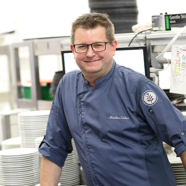 Markus Zieher ist seit der Eröffnung von DINZLER dabei und prägt die Küche mit seiner langjährigen Erfahrung und Leidenschaft. „Ich bin mit Leib und Seele Koch“, sagt er. Für ihn ist das Schönste an seiner Arbeit die Abwechslung. Alle zwei bis drei Wochen wird über die neue Karte nachgedacht, wobei die Saisonalität eine wichtige Rolle spielt. „Gemeinsam mit dem Management und meinem Team entwickeln wir neue, kreative Gerichte, die sowohl köstlich als auch rentabel sind“, erklärt er. Besonders wichtig ist ihm, dass sich alle Kollegen bei der Kreation einbringen können.