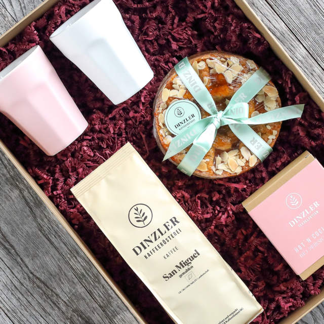 Am Irschenberg, mitten in Oberbayern, bündelt sich die DINZLER Genussexpertise. Dort vereinen sich die DINZLER Kaffeerösterei, der DINZLER Bohnenladen, die DINZLER Gastronomie und die DINZLER Vinothek zum Paradies für Genießer. Gern stellen wir mit Ihnen gemeinsam einzigartige Genussgeschenke für Kunden, Mitarbeiter oder andere Anlässe zusammen. Der DINZLER Geschenkservice verwöhnt anspruchsvolle Gaumen mit hauseigenem Kaffee, Gebäck oder ausgewählten Weinen. Gern bieten wir Ihnen auch personalisierte Geschenke mit Ihrem Logo oder individuellen Grußbotschaften an. Ein eigener Kaffee mit Firmenlogo als Weihnachtsgeschenk? Wir setzen Ihre Genussgeschenke hochwertig im einzigartigen DINZLER Stil um.