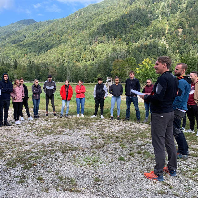 Dies durfte in Kleingruppen geschehen, aber nur mit den vorgegebenen Materialien: Holzplanken und - pfeilern und Seilen. Zu Beginn gab es einige Probleme, da die Brücke über drei imaginäre Flüsse in einer Höhe von einem Meter führen sollte. Weil aber jede Kleingruppen einen einzelnen Teile der gesamten Brücke fertigte, musste unter anderem die Höhe und Breite abgesprochen werden um Stabilität zu erhalten, damit das Kunstwerk nicht einstürzt, sobald einer darüber läuft. Diese notwendige Stabilität und dass alles mehr oder weniger gerade steht, sind Dinge die uns die ganzen Bauphase hindurch beschäftigten, außer während der leckeren Brotzeit, die wir im Gasthaus genießen durften. Während dem Verknoten der Holzstämme, entwickelten sich freundschaftliche Gespräche, man lernte sich besser kennen und zwar nicht nur die Azubis im eigen Lehrjahr oder in der selben Abteilung, sondern übergreifend über den ganzen Betrieb. So überwanden wir mit dem Bau der Brücke nicht nur „naturgegebene“ Barrieren, sondern auch die ein oder andere unnötige eigene Hemmung und lernten einmalige neue Weggefährten kennen.