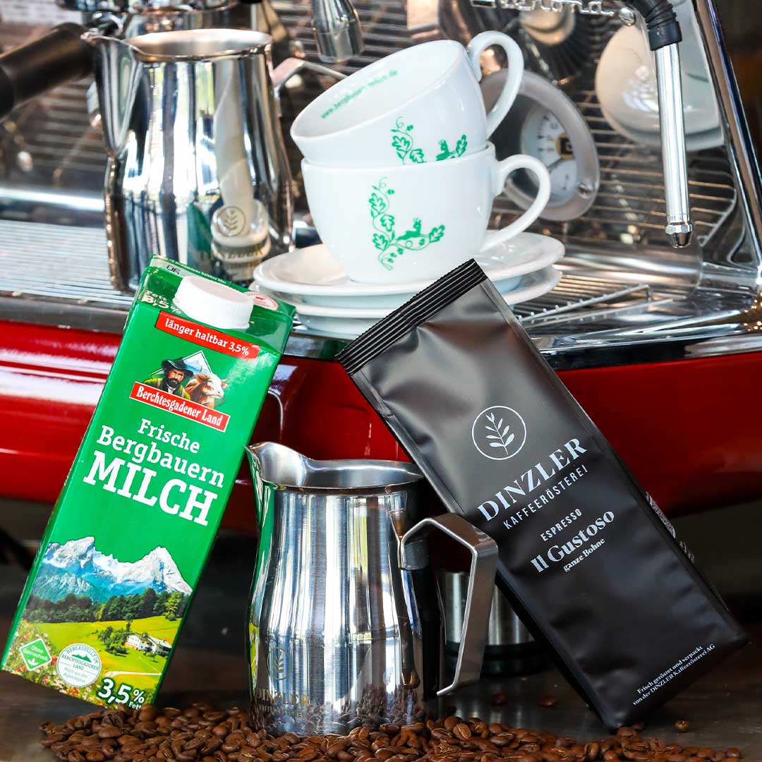 Cappuccino und Latte Macchiato sind wohl die beliebtesten Kaffeegetränke in ganz Deutschland. Im Lieblingscafé, ToGo oder zuhause: Die perfekte Krone aus Milchschaum, die den Getränken ihre angenehme Süße und Cremigkeit verleiht, gelingt nur mit der richtigen, hochwertigen Milch. In der DINZLER Kaffeerösterei setzen wir dabei seit über zehn Jahren auf die Milch von der Molkerei Berchtesgadener Land: Hohe Milchqualität, der richtige Eiweißgehalt und eine schonende Verarbeitung legen den Grundstein für perfekten Milchschaum. Durch die regionale Nähe zu Berchtesgaden und die fair bepreiste Arbeit der Landwirte erfüllt sie zudem die hohen Qualitätsstandards an unserer Kaffeebar – ideal für eine köstliche Tasse Cappuccino oder einen cremigen Latte Macchiato.