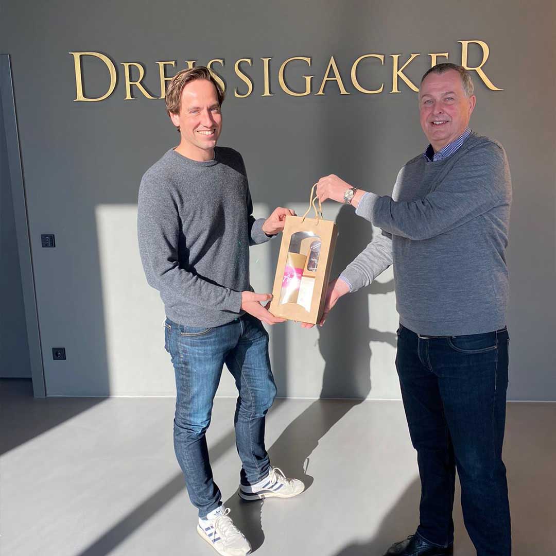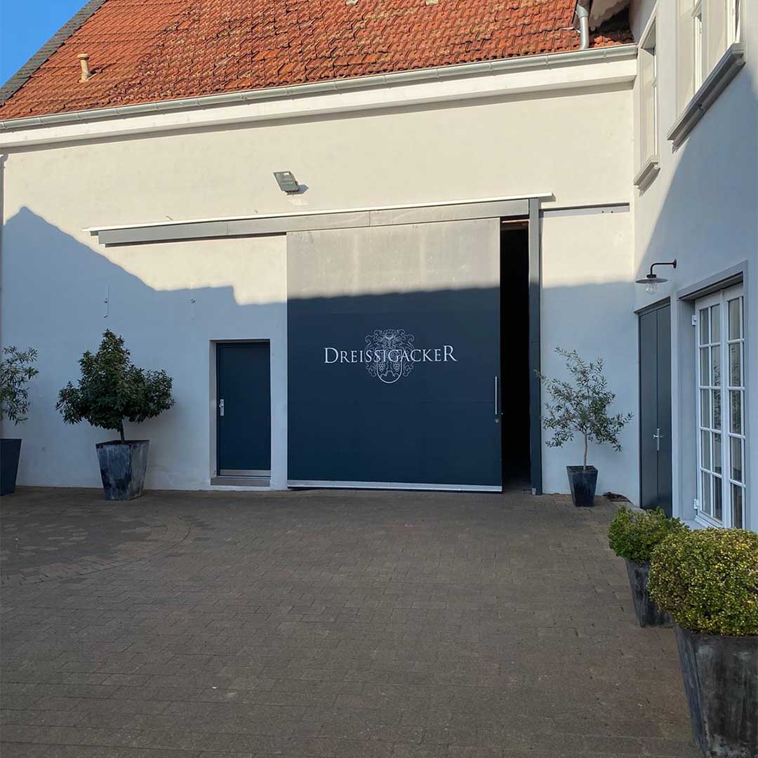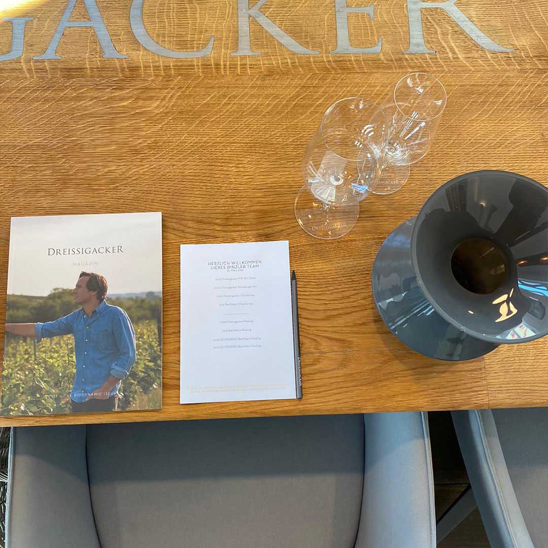 Das Weingut Dreissigacker rund um seinen smarten und sympathischen Winzer, lebt durch sein sehr junges, innovatives und dynamisches Team. Wodurch die Marke Dreissigacker in den letzten Jahren eine Exklusivität entwickeln konnte, die seinesgleichen sucht. Biodynamischer Weinbau und Weinherstellung so nah wie möglich und im Einklang mit der Natur sowie Sorgfalt in der Verarbeitung der Produkte wird hier großgeschrieben, wozu auch die enorm hohe Qualität im Gutsweinbereich beiträgt. Ein gutes Beispiel für die behutsame Arbeit ist das Anpressen der gekühlten Trauben mit den Füßen, was auf unserer Reise ein Novum darstellt. Auch die Verarbeitung der Trauben im modernen, imposanten Neubau des Weinguts, wo der Saft und Most lediglich durch Schwerkraft bewegt wird, zeigt die Sorgfalt mit der hier nach er bestmöglichen Qualität gestrebt wird. Wir sind froh mit dem Weingut Dreissigacker einen langjährigen Partner für unsere Haussekte gefunden zu haben und hoffen auf eine weiterhin langfristige und erfolgreiche Partnerschaft. Wir sind auf alle Fälle der Meinung, Dreissigacker und DINZLER: Das passt!