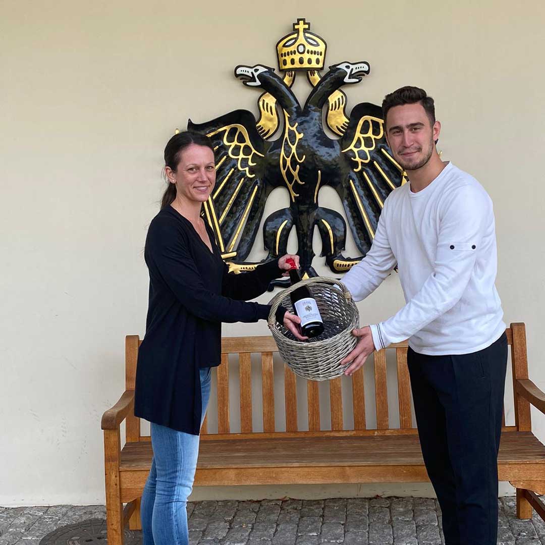 Moderne trifft auf Tradition. Die zwei Schwestern Dorothee und Karoline Gaul haben 2011 das Weingut Ihres Vaters übernommen, und leiten es mit einer Klarheit und Innovation, die uns bereits in der Hofeinfahrt begeisterte. Ein moderner Neubau zur Rechten und ein wunderschönes Bauernhäuschen zur Linken – ein Sinnbild für die Ideen und Philosophie des Schwesternpaares. Die Familie prägt die Weine – dies erkennt man vor allem am Schwesterherzcuvee von Dorothee und Karoline, aber auch im Restsortiment des Weingutes. Ein absolutes Highlight waren für uns, die von Dorothee gebackenen Pfälzer Buchteln! Gut, dass wir in unserem Gastgeschenk eine Auswahl an DINZLER Kaffeesorten mitgebracht hatten, die wir direkt zu den Buchteln zubereitet haben.