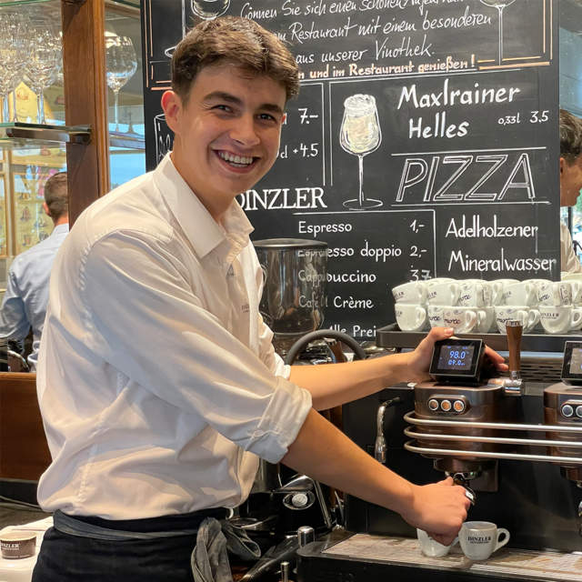 Für viele junge Menschen stellt sich nach dem Abi die Frage: Ausbildung oder Studium? Das Abiturientenprogramm zum Handelsfachwirt liefert für einige genau den richtigen Mittelweg. So auch für Valentin: ”Ich habe schon während der Schule bei DINZLER gejobbt und hatte schon immer Lust auf Gastronomie – auch wegen meiner Familie. Mit dem Abiturientenprogramm habe ich genau das richtige für mich gefunden.” Im Programm durchläuft Valentin alle Bereiche bei DINZLER und lernt die Gastronomie, die Kaffeeherstellung sowie den Kaffeevertrieb mit all seinen Facetten kennen. “Bisher gefällt mir die Vinothek am besten – ich interessiere mich für gute Weine und mir gefällt die Beratung und der Verkauf der Kaffeemaschinen. Außerdem hat die Vinothek für mich einen ganz besonderen Flair.”